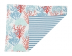 Jogo americano em tecido 100% algodão com um lado na cor off white com estampa de corais azuis e vermelhos, e um lado listrado nas cores off white e azul.
